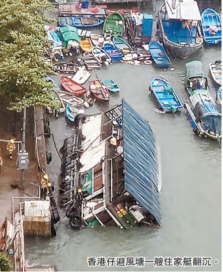 其他風中意外方面,在香港仔避風塘消防碼頭附近岸邊,一艘住家艇昨午2時許疑不敵風浪入水翻沉,消防蛙人一度到場搜索,證實花甲男船主與妻子及時離船上岸,無人被困或失蹤。昨晨10時,荃灣青山公路的南豐紡織有限公司廠廈,其中一幅10米乘30米的棚架受強風吹襲塌下,擱在毗鄰工業中心平台,有驚無險。
