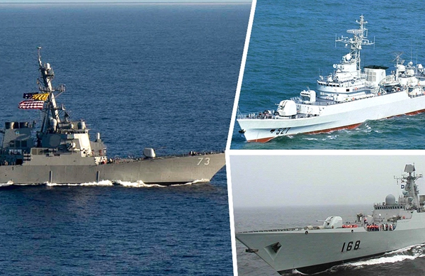 美「迪凱特」號導彈驅逐艦(左)遭「廣州」號導彈驅逐艦(右上)和「洛陽」號導彈護衛艦驅逐。