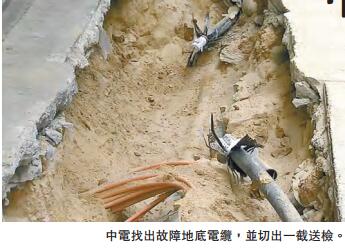 昨日中午12时许,中电人员到达广东道901号现场,将一段约两米长的电缆拆走,并用黑胶布包裹送走检查。至昨午2时,工人在移走电缆位置外的5米外行人路,再检走另一段电缆,该条电缆有明显燻黑及被水渗过痕迹,不排除是引致短路的源头。