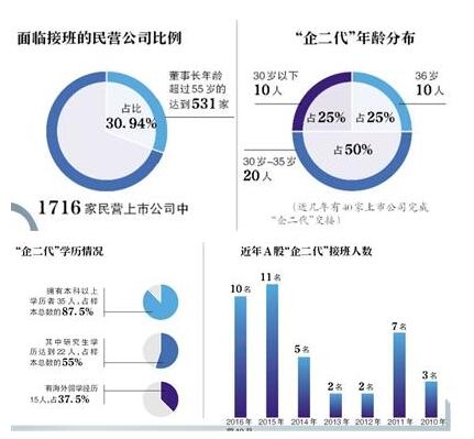 在未來,“企二代”接班的數量還將不斷增加。新京報根據同花順數據發現,能夠統計到的1716家民營上市公司中,董事長年齡超過55歲的,達到531家,占民營上市公司總數比的30.94%。這意味著,未來5年有三成的民營上市公司面臨權力交接。而董事長年齡超過60歲的民營上市公司,也多達306家,這些企業眼下都需要考慮由何人接班。