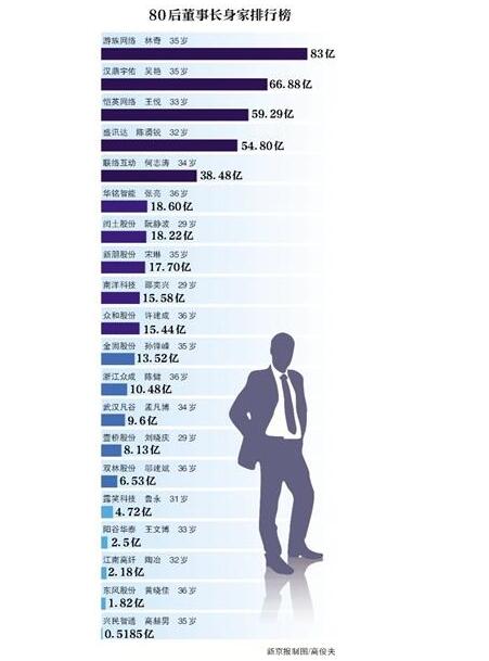 來自游族網絡、漢鼎宇佑、愷英網絡等公司的“80后”董事長,則因為本人即為企業創始人,通過借殼等方式讓旗下企業上市,直接持有上市公司股權較多,身家則顯著高于“企二代”們。其中游族網絡董事長林奇,持股市值高達83億元,排名所有“80后”董事長身家首位。