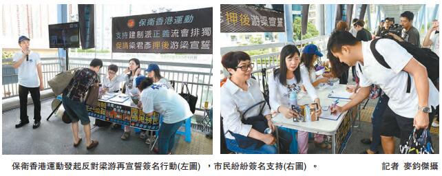 街站由昨日下午3时半开始设立,多名市民签名表示支持。主办团体保卫香港运动主席傅振中指出,梁游二人辱华,散播港独犯众憎,举办签名运动是希望可让街坊也能表态。他表示,稍後会发起集会,在星期三早上於立法会示威区外声援建制派,若梁君彦选择不押後梁、游二人的宣誓仪式,将计划在周末发起游行,让更多市民有机会以行动表态,又估计至少可收集到2000个签名。