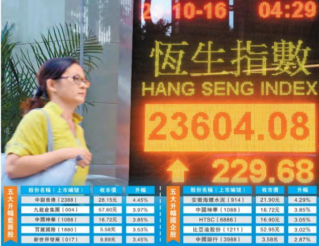 【香港商報网訊】記者伍敏報道:六中全會昨起召開,加上「深港通」開通在即帶動兩地氣氛,港股昨於期指結算前反覆向上,締結兩連升,并一舉收復10天及20天線,收市升229點或0.9%,報23604點(圖)。港股成交昨增至740億元,預料於恒指周五結算前仍有力再上。