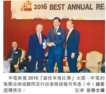 【香港商報網訊】記者鍾穎琳報道:中電控股(002)榮膺由香港管理專業協會主辦及南華早報協辦之2016年「最佳年報比賽」的最高榮譽——「最佳年報獎」,這是中電控股連續兩年獲得此殊榮。