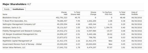 黑石集團在2007年以包括債務的260億美元價格收購希爾頓,是當時有史以來最大規模的杠桿收購交易之一,當年持股比例約為76%。