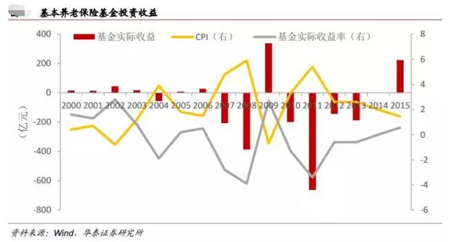 由于投資保守,養老保險基金的投資收益非常有限。據華泰證券研究報告,根據人社部的公布情況、《中國養老金發展報告》公布的利息收入等信息基本可以推斷,中國基本養老保險基金的投資收益基本維持在2%左右。若按照2%的投資收益,減去通脹水平,實際收益率基本為負,2000年到2015年間的平均實際投資收益約為-0.25%,年均貶值約為72億,總體來說,基本養老保險基金保值增值的能力較弱。