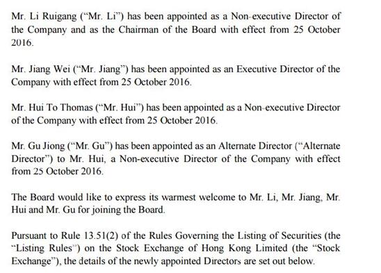 同時公告稱,葉家海已辭任董事會主席及執行董事,顧炯及黃家正已辭任非執行董事,委任姜偉為執行董事,委任許濤為非執行董事,顧炯獲委任許濤為替任董事。
