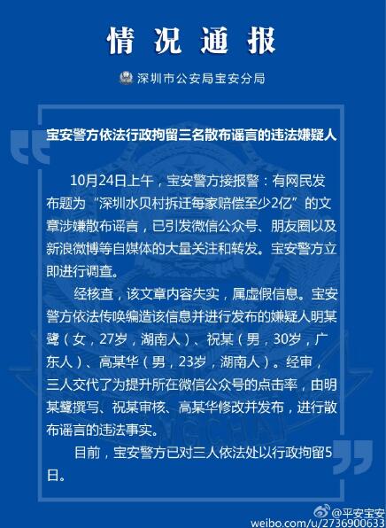 平安寶安:10月24日,警方接報接:有網民發布題為“深圳水貝村拆遷 每家賠償至少2億”的文章涉嫌散布謠言,已引發微信公眾號、朋友圈以及新浪微博等自媒體的大量關注和轉發,寶安警方立即進行調查。經核查,該文章內容失實,屬虛假信息。目前,警方已對三名嫌疑人依法處以行政拘留五日。
