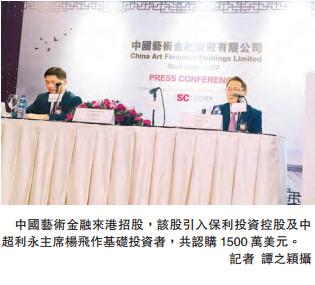 內地藝術金融服務供應商,中國藝術金融亦於今日起公開招股,該公司計劃全球發行4億股,最多集資3億元。每股發售價0.6元至0.75元,以每手4000股買賣計算,入場價每手約3030.23元。該股引入保利投資控股及中超利永主席楊飛作基礎投資者,共認購1500萬美元。