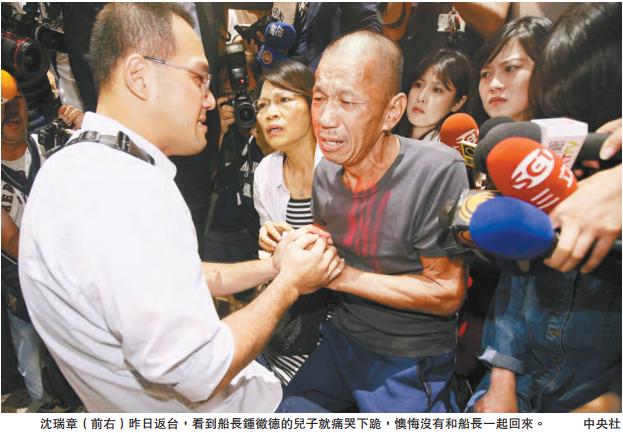 面對采訪媒體,沈瑞章落泪說,「很感動」,但內心還是很沉重,「因為沒有跟船長一起回來」。
