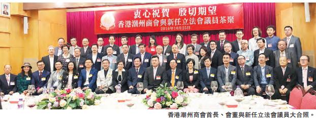 【香港商報网訊】記者謝巧玲報道:香港潮州商會首長、會董日前與新任立法會議員茶敘,出席的12位立法會議員包括陳健波、梁美芬、葉劉淑儀、謝偉俊、姚思榮、陳恒鑌、郭偉強、葛珮帆、廖長江、周浩鼎、柯創盛、張國鈞。會長胡劍江表示,未來面對挑戰重重,如何做好維護香港利益的大事,怎樣做好利港利民事務,有賴立法會議員同心協力,商會承諾配合大家,為香港的繁榮安定作出努力。