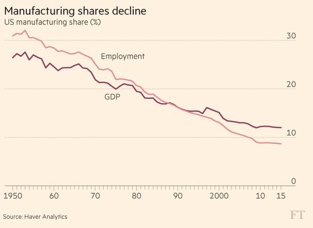 比這種不愿推進貿易自由化的情緒更具威脅性的是,原始形式的純粹保護主義的興起。美國共和黨總統候選人唐納德?特朗普(Donald Trump)就擅長發表此類主張。實際上,他表示,抑制進口將會奇跡般地恢復在美國“偉大”時期存在的制造業崗位。然而,正如哥倫比亞大學(Columbia University)的賈格迪什?巴格瓦蒂(Jagdish Bhagwati)指出的那樣,“制造業就業人數的下降已持續了半個世紀”。隨著美國制造業產值占整體經濟產值的比重穩步下降,制造業就業人數占整體就業人數的比例也相應下降,只是降速更大一些,因為制造業生產率增長快速。任何貿易政策都無法扭轉這一趨勢,它是受到需求變化和科技變革推動的。制造業只是重蹈農業曾經的軌跡。