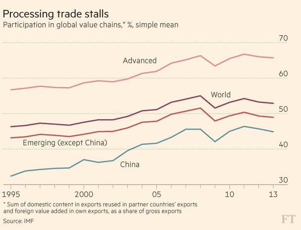 自上世紀90年代以來,不同經濟體之間的勞動分工——一些經濟體制造零部件,然后由其他國家組裝——促進了生產鏈內部的貿易。這可以通過如下方式衡量:一國出口商品中所包含的進口成分價值,加上該國出口給貿易伙伴國用于制造出口商品的材料中所包含的國內成分價值,然后除以出口總值。這個比率到2008年一直在上升,但自那以后停滯。這標志著至少有很大一部分的跨境生產一體化陷入了停滯。