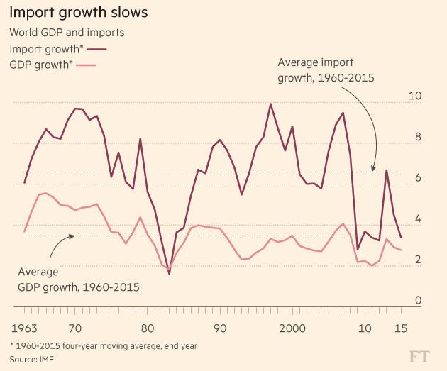 從1960年到2015年,按實際值計量,世界貿易平均增長率達到6.6%,同時產值平均增長率為3.5%。然而,從2008年到2015年,世界貿易年均增長率按實際值計量僅為3.4%,同時全球產值年均增長2.4%。不僅貿易增速放緩,而且貿易增速與產值增速之間的差距也急劇縮小。