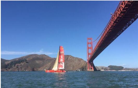 10月18日,郭川驾驶三体帆船,经过旧金山地标建筑金门大桥。