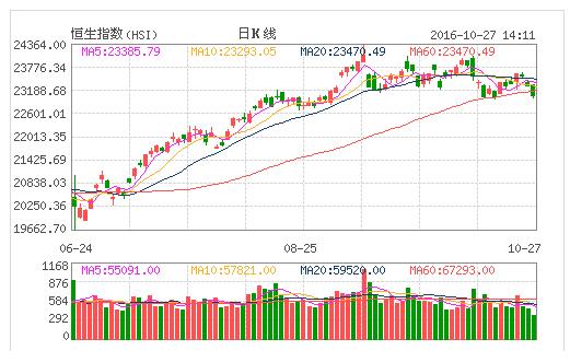 中國銀盛資產管理董事總經理郭家耀分析,美股周三個別發展,企業業績表現參差,大市先跌后回穩,美股三大指數升跌互現。美國庫存意外下降,油價一度急升,其后高位回吐。加息預期升溫,美國10年期債息上升至1.79厘水平。港股跟隨外圍調整,中資股第三季業績乏驚喜,短線缺乏利好因素刺激,大市在期指結算前維持整固格局,指數預料于23000至23500點水平上落。