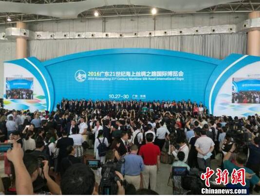 備受海內外關注的2016廣東21世紀海上絲綢之路國際博覽會(以下簡稱“海絲博覽會”)27日在廣東東莞開幕,73個國家和地區參會覓商機。圖為開幕式現場。李獲攝