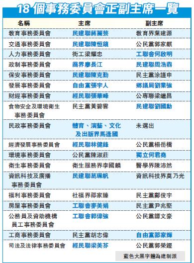 在18個事務委員會之中,建制派包攬政制事務委員會及發展事務委員會的正副主席,而保安、財經、教育、民政、交通、經濟、資訊科技及廣播、房屋、公務員及資助機構員工、司法及法律等的事務委員會主席,均由建制派議員擔任,合共奪去12個主席席位,當中民建聯議員占三分之一,包括教育(蔣麗芸)、交通(陳恒鑌)、保安(陳克勤)、資訊科技及廣播(葛珮帆)。
