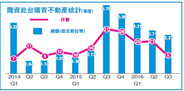 台灣地政部門昨日公布今年以來陸資赴台購置不動產狀况,今年至第3季為止僅50件,未逾百件;若逐季觀察,從第1季20件、第2季21件,第3季僅9件,為8季以來首見個位數;另若從單件均價來看,單件均價新台幣3749.8萬元,創下9季新高。