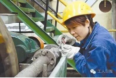 球磨班女工調節球磨機水管水壓