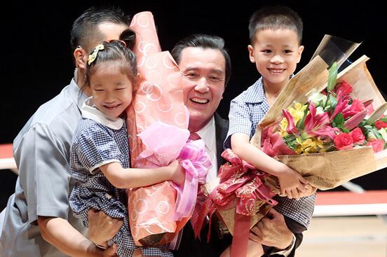 马英九上午出席静心中小学校庆,并在随扈协助下奋力抱起两名献花的小学弟妹。