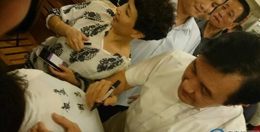 马英九在民众背后提笔写下“尽忠报国”,落款“岳母题”