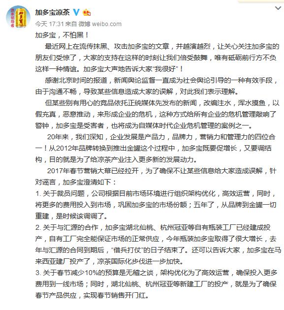 此外,加多寶方面強調稱,目前公司高管全部在崗,無一離職,所有員工薪資發放準時,員工各項福利正常,人員崗位晉升與加薪正常。