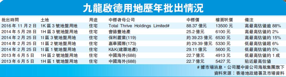 地政總署9月下旬起以招標形式推售上述啟德住宅地,上周五(10月28日)截標。招標期間適逢九龍新地王誕生,嘉里(683)於10月上旬以73億投得一幅筆架山豪宅地,樓面尺價高達逾2萬元,創全九龍新高,加上一手及二手交投暢旺,市場樂觀估計該啟德住宅地最高尺價高達7200元,較過去6幅啟德地(2013年6月至2014年5月批出)的尺價4913元至6100元水平為高。但招標結果仍然令人極為意外。據地政總署周三(11月2日)公布,上述1K區3號地盤住宅地是約88.3712億元批予TotalThriveHoldingsLimited旗下香港海島建設地產。若按最高可建總樓面約65萬平方尺計算,樓面尺價高達1.35萬元,即高出市場預期約88%,亦高出2014年2月由會德豐地產投得住宅地逾1.2倍。