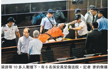 暂停之后,会议室外情况变本加厉,梁游等十多人与保安纠缠,其间多达6位保安员不适或受伤。有见於此,梁君彦指示秘书处报警。其后,警方机动部队进入立法会,救护人员亦送受伤保安到医院治理。
