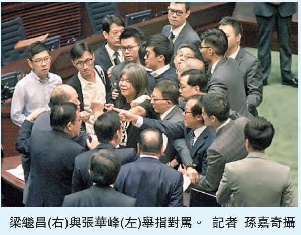 【香港商报网讯】记者林骏强、冯炜强报道:立法会大会昨日在青年新政梁颂恒、游蕙祯带同多人暴力冲击下,不论是会议厅及会议室,各处都爆发混乱,令6位保安员受伤。冲击行动引起的混乱之大,令人咋舌。有建制派议员形容,昨日议会的混乱情况是前所未见。梁颂恒更在会议厅内以粗言「仆街」挑衅建制派议员,一派流氓作风,行径恶劣。