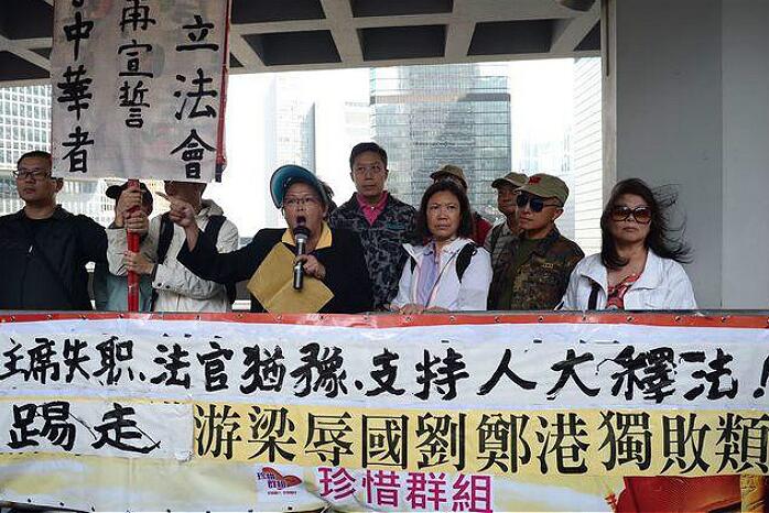 香港政贤会、珍惜群组等团体约30人,趁梁游宣誓时引发的司法覆核案在高等法院开审,早上到法院外示威和向律政师代表递交请愿信。请愿人士形容梁游为败类,要求法官将二人逐出议会。