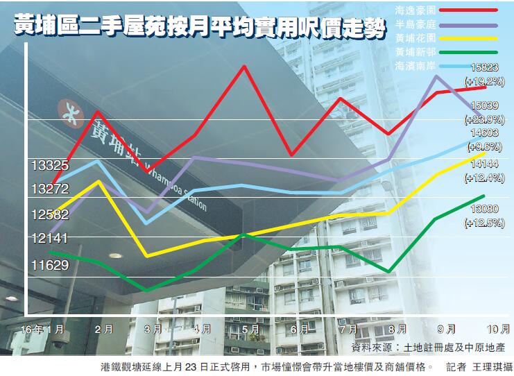 【香港商報網訊】港鐵觀塘延線上月23日正式啟用,除讓何文田、紅磡及黃埔一帶的居民提供多一個交通選擇,市場亦普遍憧憬會帶升當地樓價及商舖價格,產生「鐵路效應」。有地產代理綜合土地註冊處數據指,截至今年10月,黃埔主要二手屋苑成交個案平均實用尺價,今年以來升幅高達近一成至超過兩成不等,明顯跑贏同期全港二手樓約一成升幅。香港商報記者曾浩榮
