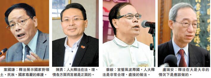 港區人大代表、行政會議成員葉國謙認為,人大是次主動釋法,是看到香港現時有些人公然搞「港獨」,并留意到有人在莊嚴的建制法定機制內,竟然辱罵國家及民族,因此要進一步清晰展示國家對領土、民族、國家尊嚴的維護。他強調,憲制上很清楚,釋法是人大常委會的權力,也是法律組成的部分;他批評有些人聲稱釋法破壞法治,是扭曲、不負責任的說法,釋法其實是擁護《基本法》及「一國兩制」。他認同人大釋法有一錘定音作用,具法律效力,法庭亦有責任按照此解釋作判決。