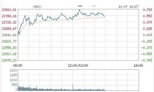 港股早段反覆向上,恒生指數高開40點后一度倒跌,之后在一眾重磅股帶動下,恒指再升近22800點,午后港股繼續上漲,升穿上午高位,高見22812點,截至發稿,恒生指數漲0.61%,報22778點,成交額370.4元。
