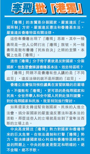 李飛表示,這些年香港出現了「港獨」思潮,其中一種表現是一些人公開打出「港獨」旗號。6日晚在香港也發生了一件事,也有人公開打出「港獨」旗號,公然煽動「香港獨立」、「香港建國」。另一種表現是散布香港「民族自決」之類的主張,本質上也是「港獨」。這些人罔顧「香港屬於中國」的歷史事實和現實法律地位,公然挑戰憲法和香港基本法,直接危害國家統一、國家主權和領土完整。這些違法行為的直接後果就是衝擊香港法治,破壞香港社會秩序,阻礙經濟民生發展,擾亂居民正常生活,甚至用暴力手段製造流血衝突,損毀香港的營商環境和國際聲譽。
