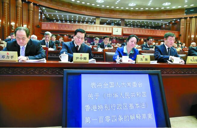【香港商報網訊】全國人大常委會第24次會議7日上午經過表決,全票通過了人大常委會關於香港基本法第104條的解釋(下稱「釋法」)。人大委員長張德江指出,人大釋法與香港基本法具有同等法律效力,各方面必須一體遵守和執行。人大常委會副秘書長李飛當天表示,全國人大常委會履行憲法和基本法規定的憲制權力作出的釋法,具有最高的法律權威;在依法遏制和打擊「港獨」勢力、堅決維護國家核心利益和香港特區根本利益的問題上,中央態度堅定、明確,絕不含糊,絕不手軟。