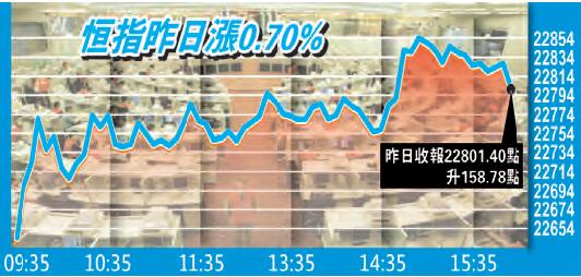【香港商报网讯】记者伍敏、邝伟轩报道:本周美大选动向牵股市神经,受希拉莉选情好转带动,恒指昨高开40点後表现向好,最多升过225点,收市升158点或0.7%,报22801点,终止3连跌,成交增至604亿元,惟政府加辣冷却楼市,地产股逆市急插。另港股通余额98.91亿人民币;沪股通余额128.97亿人民币。