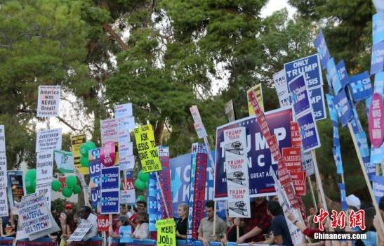 資料圖:美國總統大選支持者在內華達大學拉斯維加斯分校內表達政治立場。