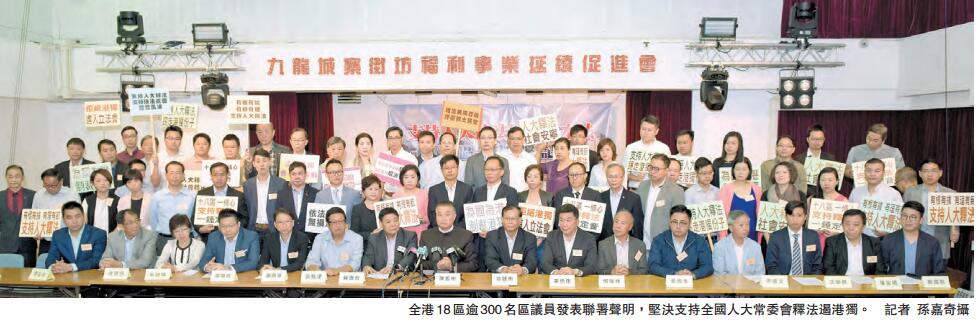 【香港商报网讯】记者潘仲男报道:全国人大常委会日前就《基本法》第104条进行释法。本港18区区议会超过300名区议员昨日发表联署声明,坚决支持人大常委会透过释法,依法处理宣誓事件,认为可有效遏制「港独」主张在港散播。区议员同时谴责部分反释法游行示威者周一(7日)凌晨在西环触发骚乱。