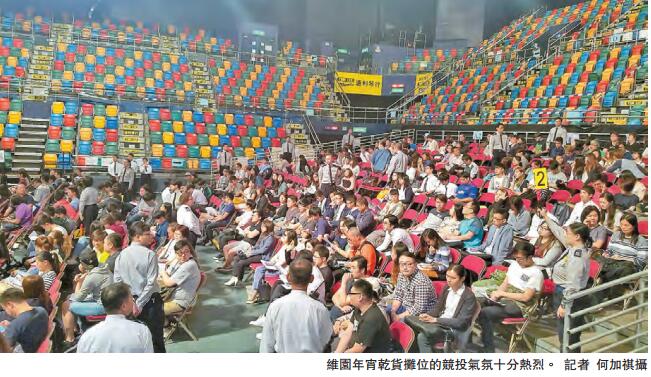 至於在乾货摊位方面,竞投十分热烈,尤其是在竞投位於路口位置的摊位时,当中18号的摊位更曾经历52口叫价,终以6.25万元成交。成交价最高的是31号摊位,同样位於路口位置,成交价为7.2万元,仍较去年略为低。至於30号档位去年是由「鸡仔饼大王」梁锐洪投得,但今年却被公民党以7.15万元「夺」走档位。