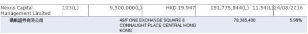 根據港交所最新數據顯示,中渝置地(01224.hk)主席張松橋旗下的力信資本管理有限公司(Nexus capital management limited)目前其持有萬科H(02202.HK)151775844股,占萬科H總股本的11.54%。其持倉成本為19.947港元/股,總耗資30.27億港元,最后買入日期為8月24日。此外,新世界集團鄭家純家族的御用券商鼎珮證券持有萬科H股的股權比例為5.96%。