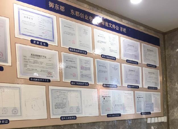 在燕郊御東郡的售樓處,可以看到墻上張貼的審批文件、銷控板和價格公示欄。該項目的銷售人員表示,目前在售的是商住部分,因為之前開過盤了,所以要把銷控板都公示出來,“檢查(組)的人剛走。”