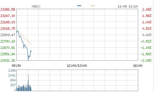 隔夜美股收漲,恒生指數今早高開0.61%,重返23000點之上,開盤后升幅隨即收窄,并倒跌,最高跌逾400點,低見22455點,截至發稿,恒生指數跌1.78%,報22496點,成交額103.93億元。
