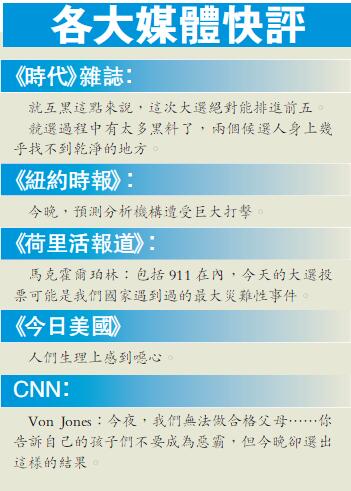 不過也有分析人士指出,將有大量美國人很長時間無法在感情上接受特朗普成為他們的總統,美國在選后重新彌合、團結起來將非常困難。美國是由精英群體把持的國家,全美中高層掌握實際權力的人大部分都反對特朗普,從而形成讓他絕望的牽制力。這讓特朗普的競選承諾和一些想法難以兌現及施展。