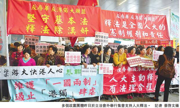 东区区议会议员王国兴参加了集会,并带领人群高呼「撑释法、反港独」的口号。集会结束後他告诉记者,今天是人大释法後立法会第一次开会,希望「港独」分子不再捣乱,立法会恢复正常运作。