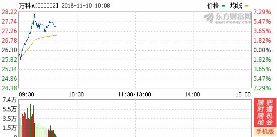 截至發稿,萬科A報27.97元,漲幅6.46%。