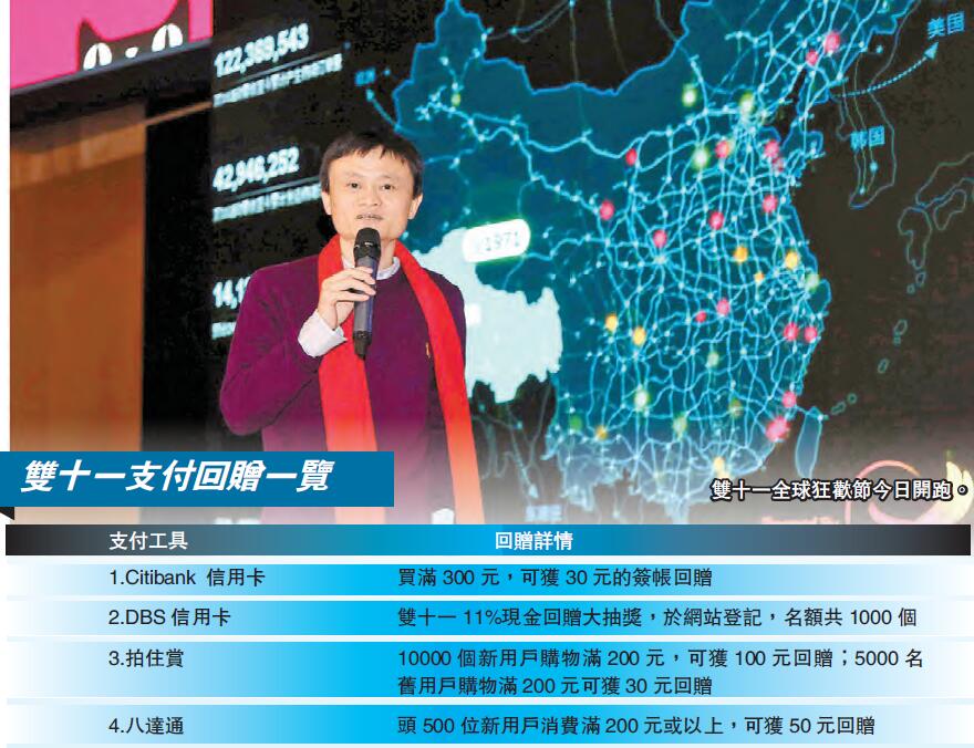 今年雙十一特別照顧香港用戶,香港用戶不用登入內地天貓官網,因為天貓正式登陸香港,對廣大淘寶迷來說簡直是一個大喜訊。而且,香港用戶更可以指定信用卡及八達通結算可享回贈優惠,一眾淘寶迷當然不能放過這個機會。不過,今次雙十一回贈優惠只限Citibank信用卡、DBS信用卡、Tap & Go「拍住賞」及八達通,只可於今日使用。