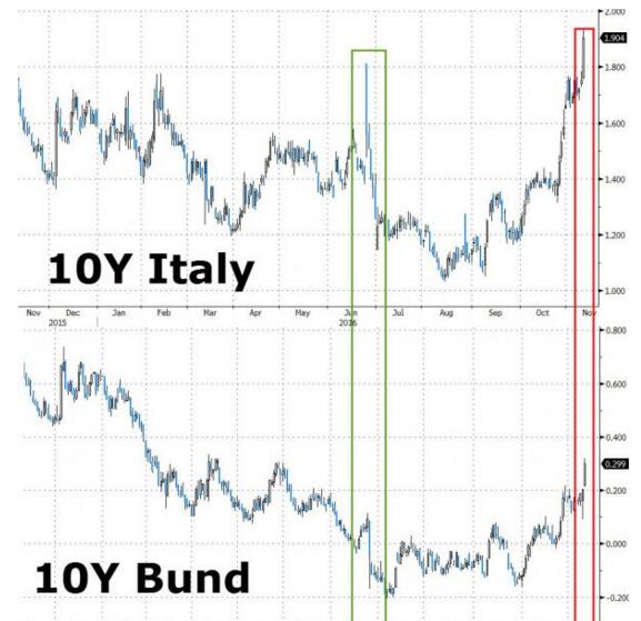 下一個“黑天鵝”意大利同期國債飆漲20個基點至1.95%,為去年9月以來最高水平。意大利將于于12月舉行的修憲公投更添局勢不安定因素。意大利和西班牙同級國債之間的息差ES10Y,被視為政治風險的指標,已經接近2012年歐債危機以來的最高水平,49個基點。