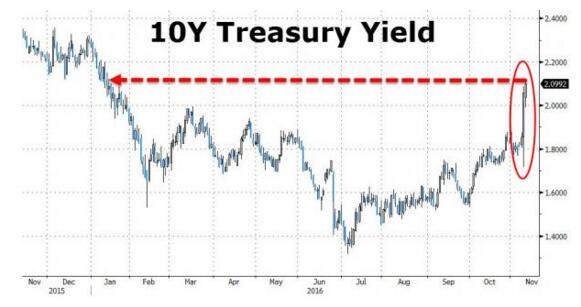 美國來看,美國10年期國債收益率沖上2.10%,連續四天上漲,創今年1月以來新高,并且走出2015年以來最為陡峭的飆升曲線。周三當日跳漲的20個基點,更是自2013年7月以來的最高漲幅。另一個長期通脹指標——美國5年期國債收益率升至2.38%,創2015年7月以來新高。