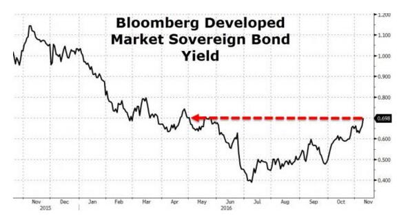 大選次日,全球債券市值合計縮水3370億美元。周四,債市拋售潮更為兇猛,歐美國債價格全線下挫,全球發達市場國債收益率已達到6個月高點。